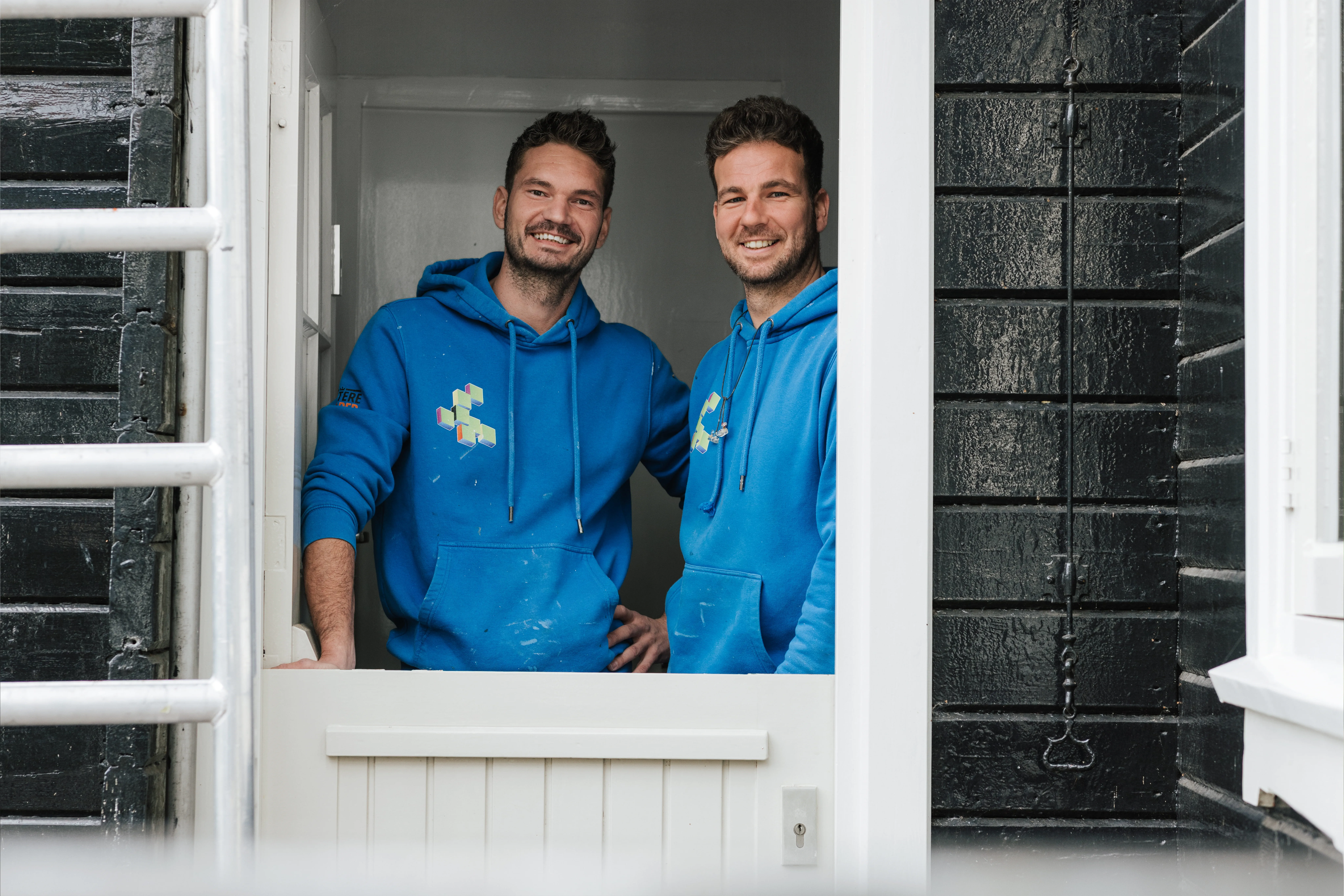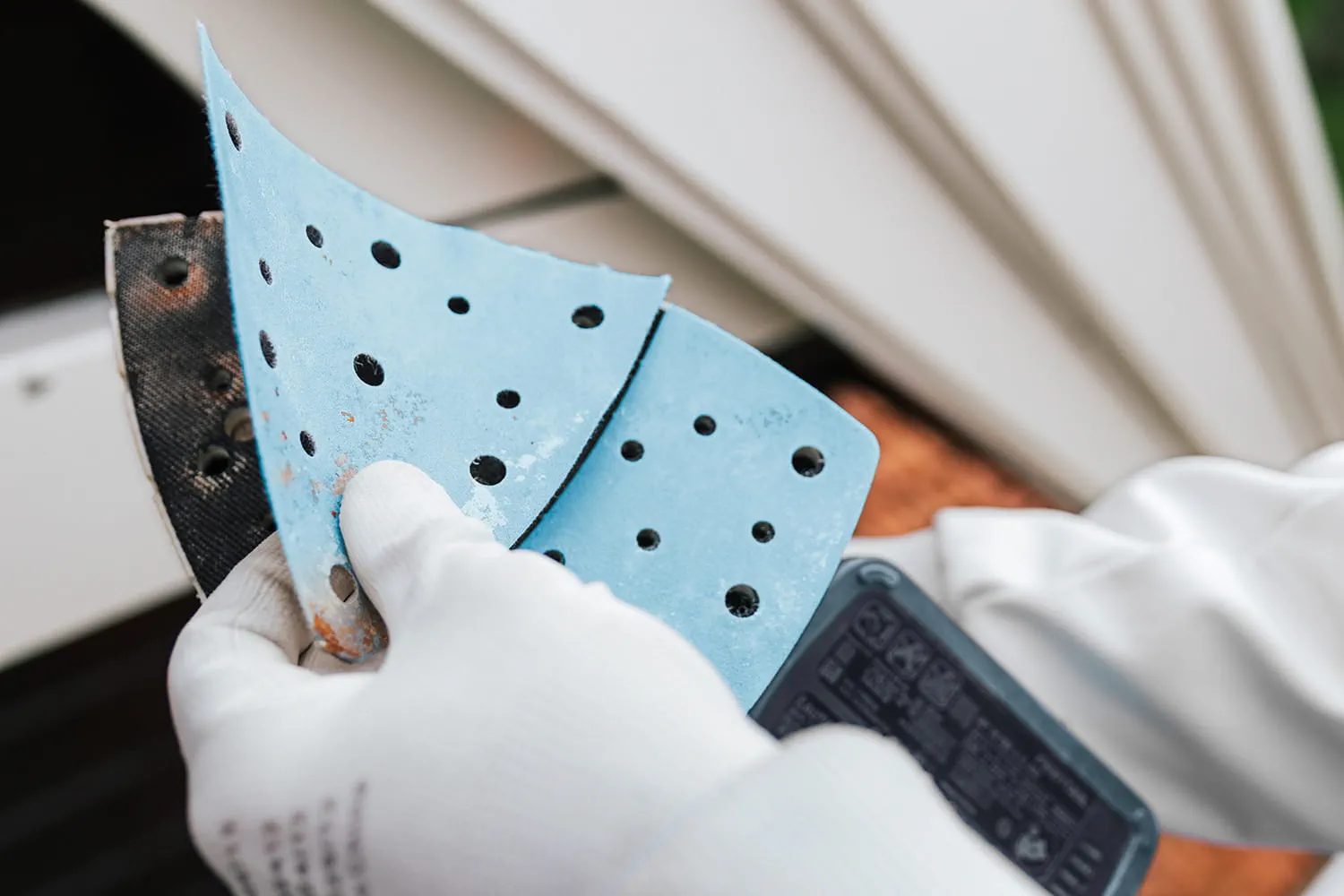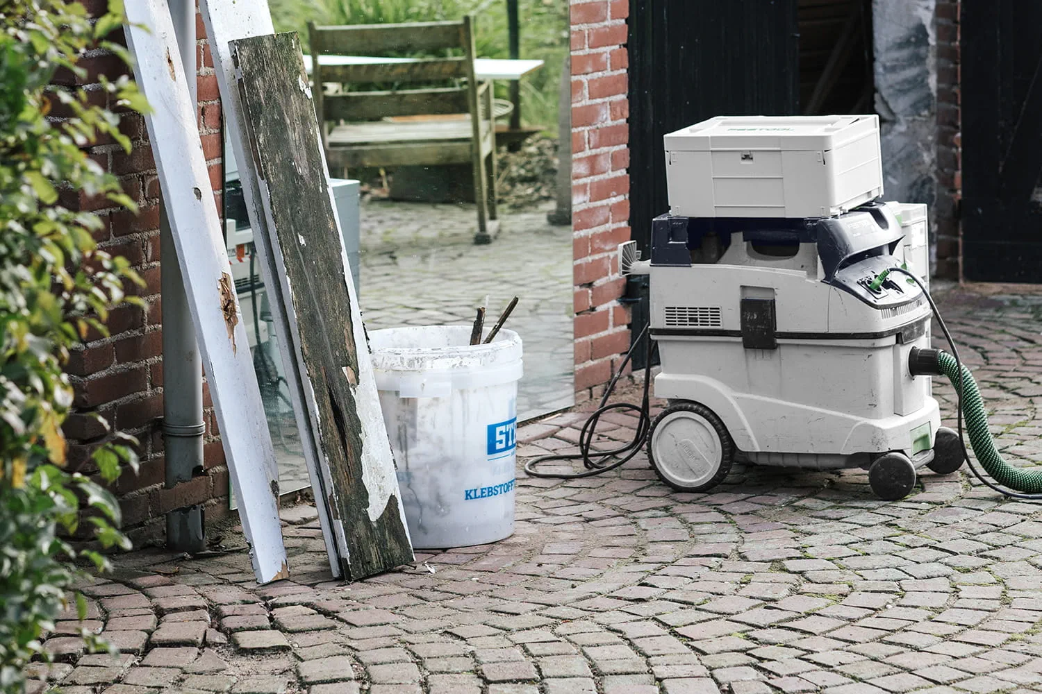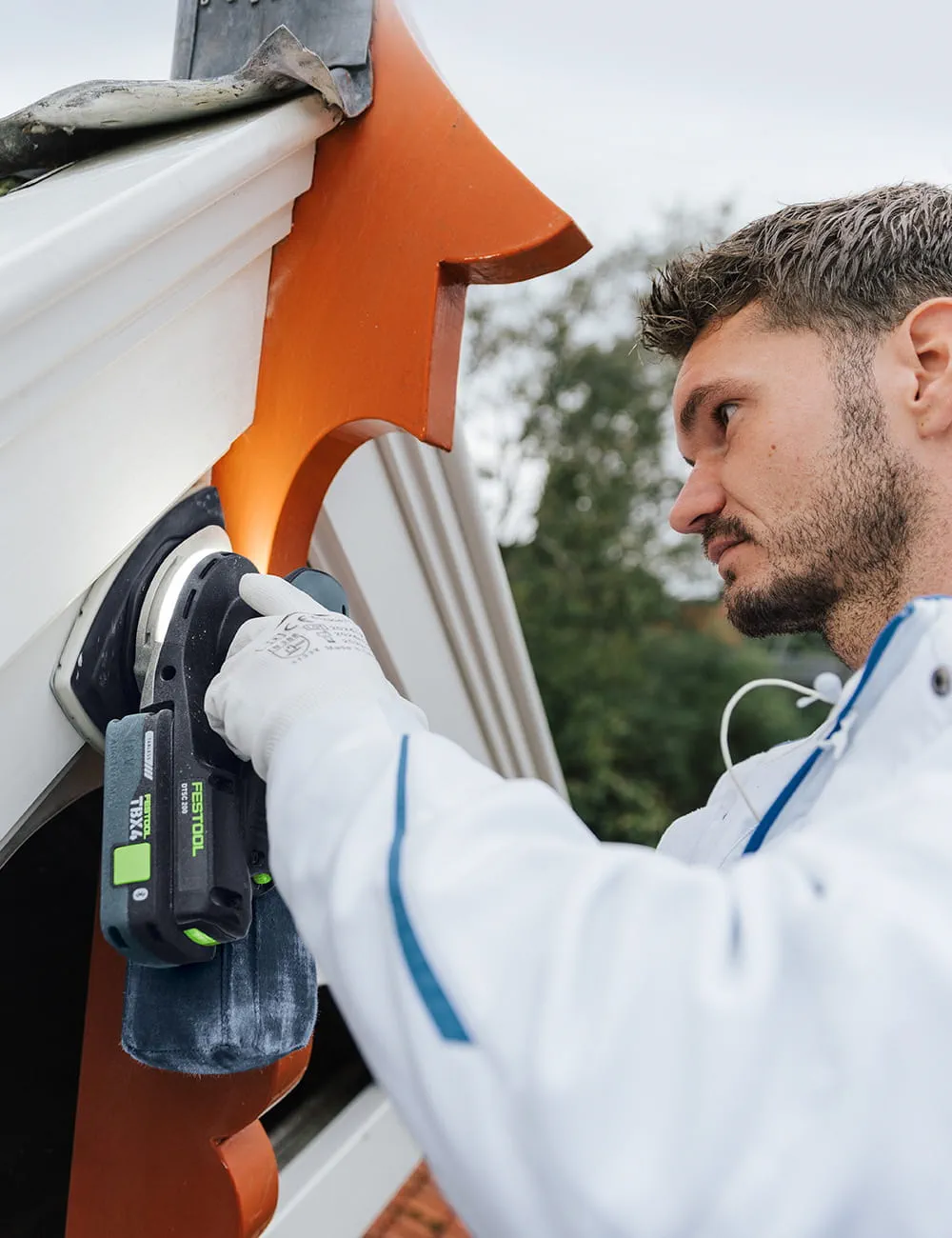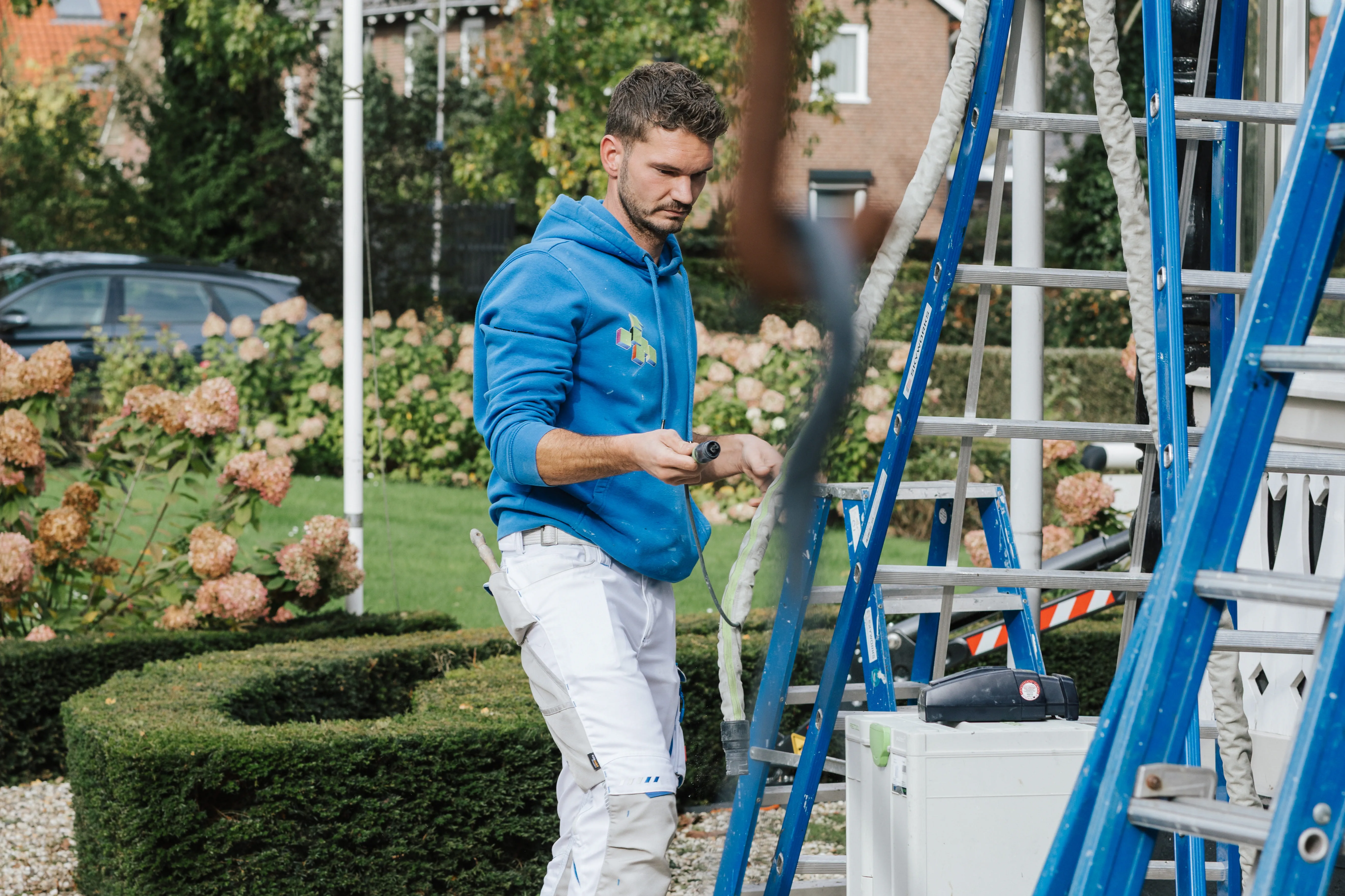 Mladý malíř přikládá velký význam práci venku na stoupačce s odsáváním prachu nebo Vakem na prach. Může totiž pracovat čistěji a chránit se. "Mnoho mých kolegů to při práci venku podceňuje," volá shora. "Ale tady v Holandsku máte vždycky poryvy větru, které vám v nejhorším případě při broušení vhánějí prach do obličeje."