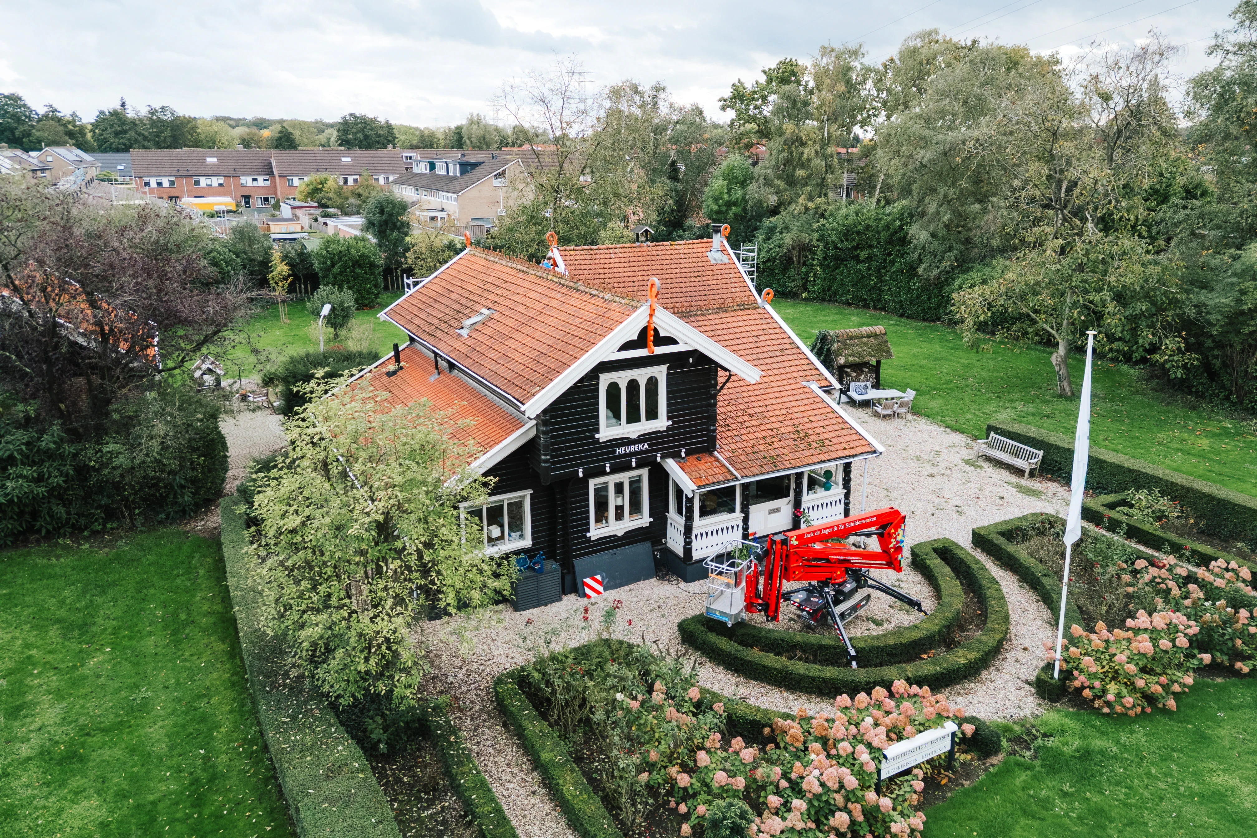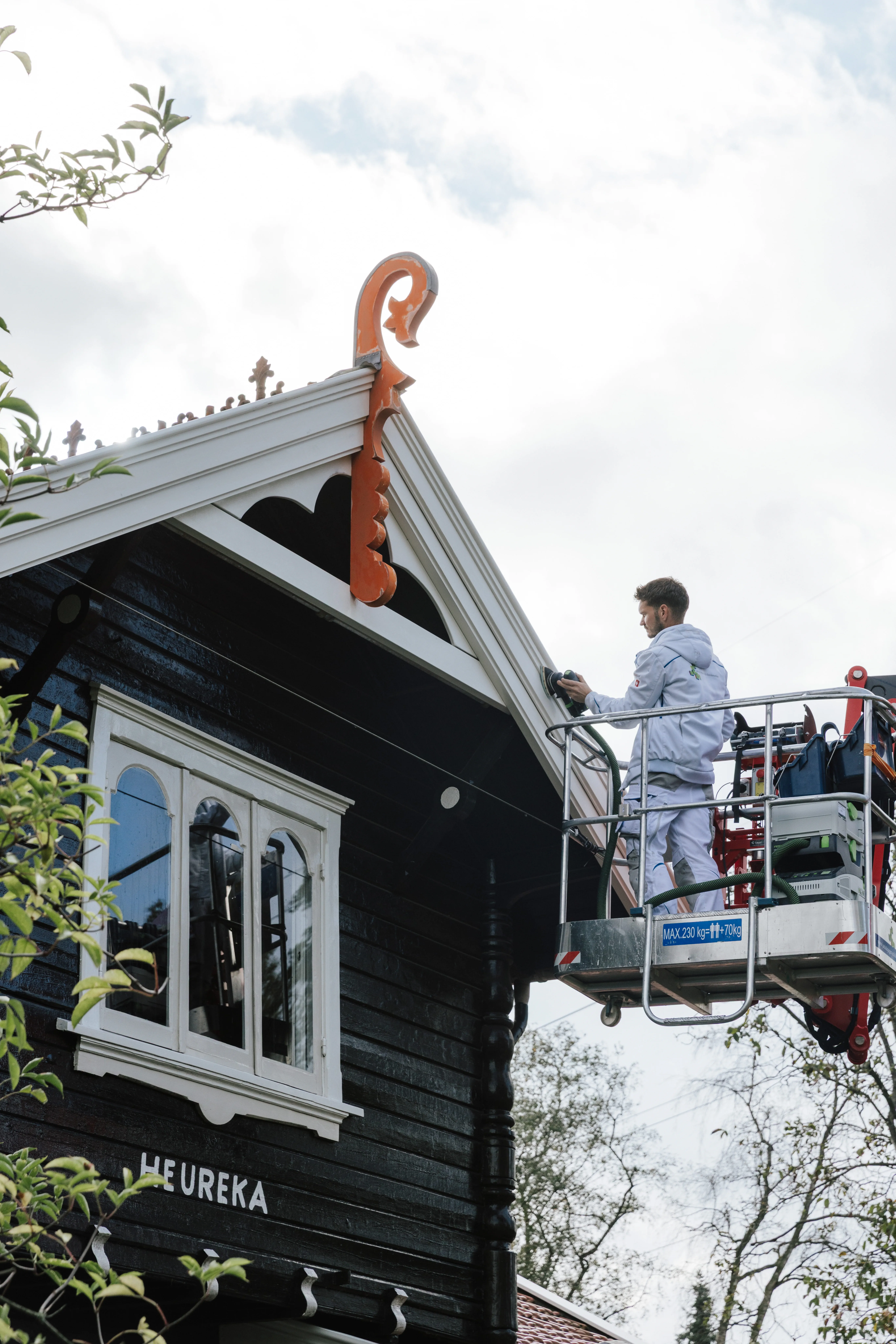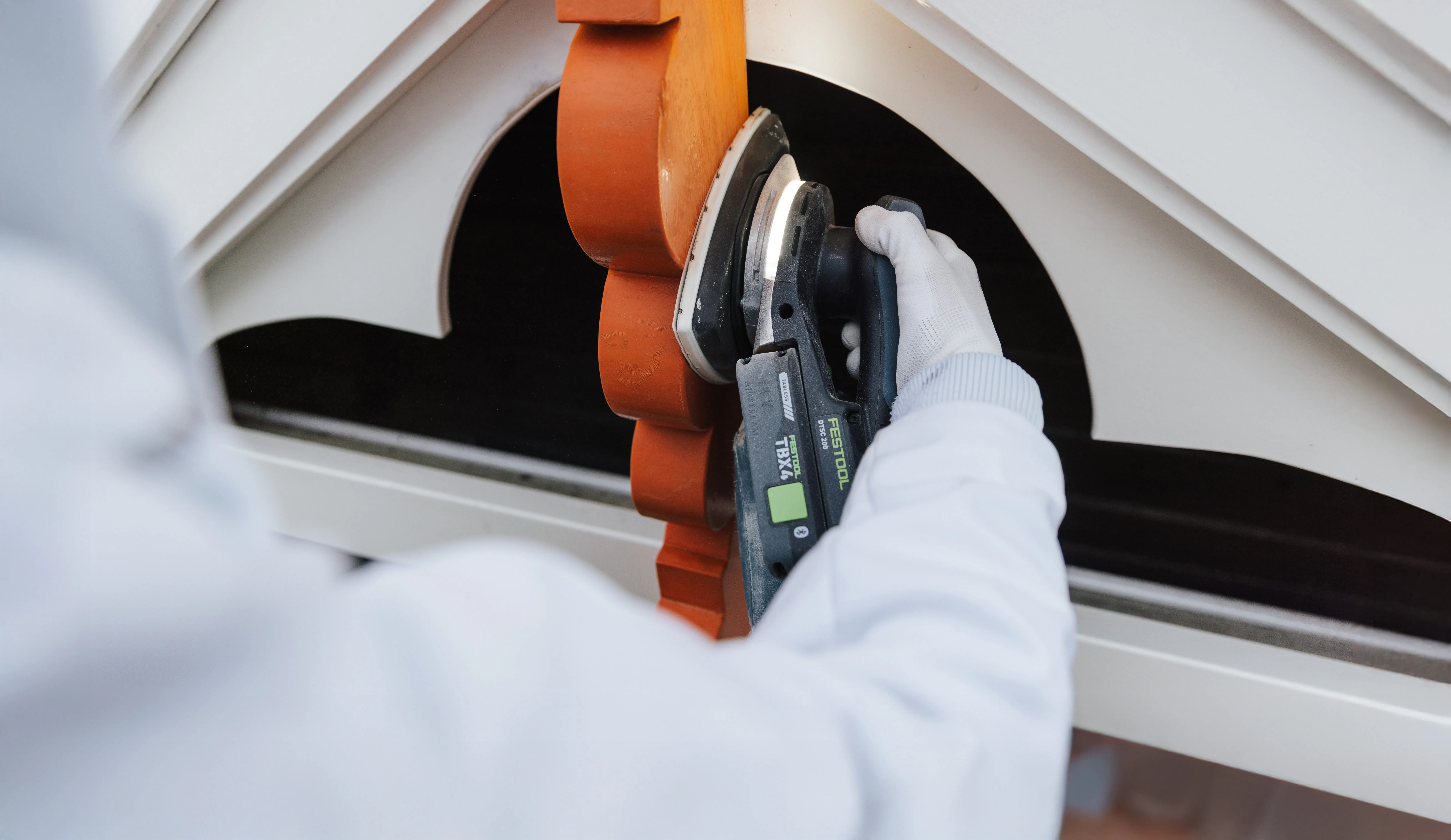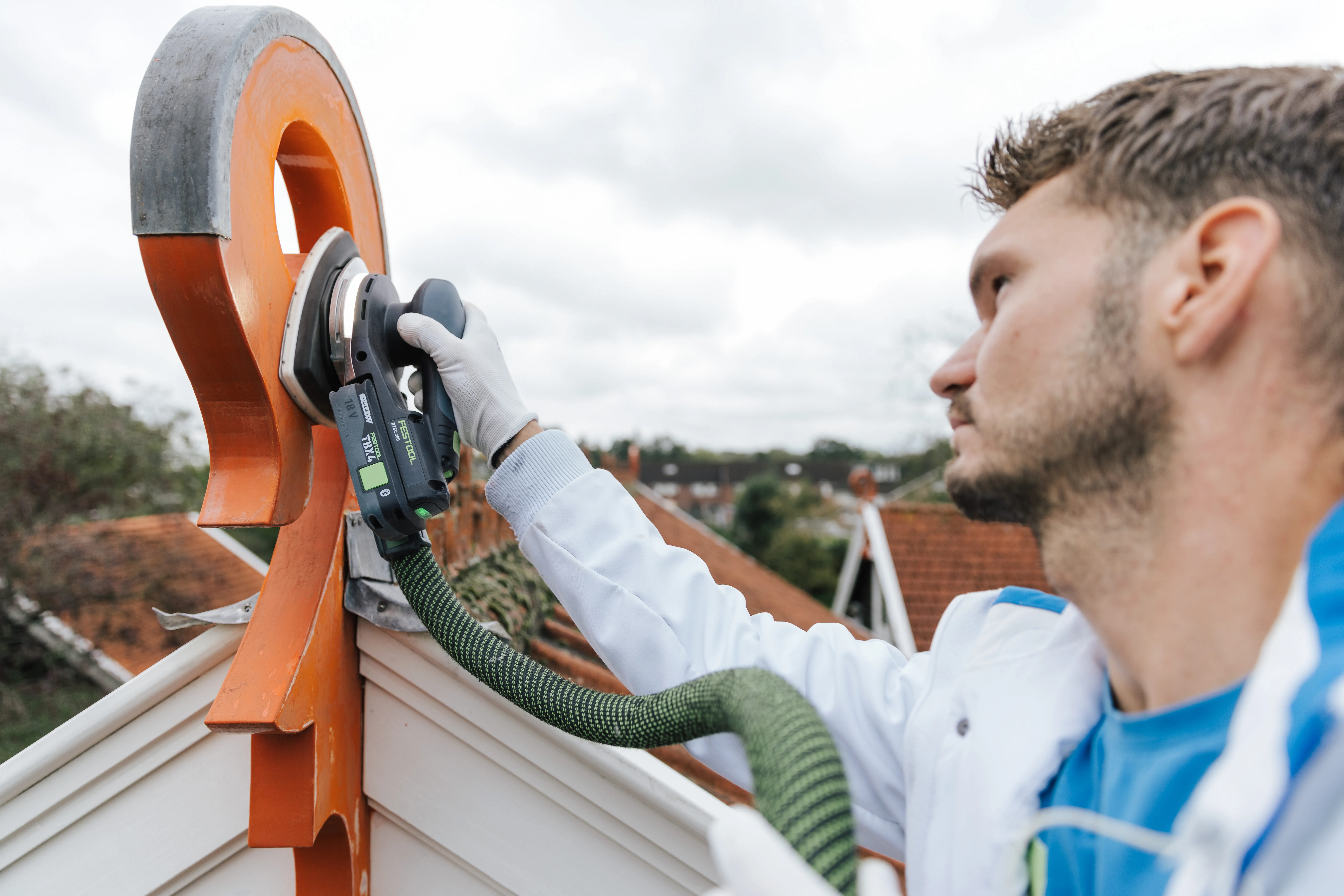 Luke de Jager pracuje nejraději vysoko na Steigeru. Pečlivě brousí charakteristický střešní ornament, který trůní na hřebeni střechy v tlumeném oranžovém odstínu. Dřevěný povrch je zvětralý a nátěr se již odlupuje. Vibrační bruskou DTSC 200 Luke dosahuje také zakřivených, profilovaných a zkosených povrchů. Když je něco obzvlášť šikmé, použije brusku DTSC 400.