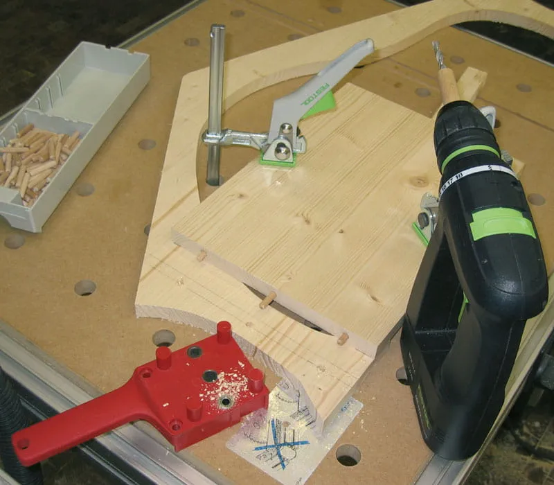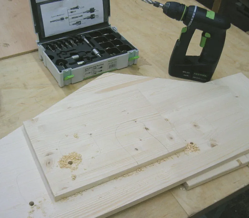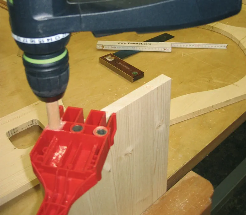 Pomocí šablony pro kolíky se vyvrtají otvory pro kolíky (ø 6 mm) do příček bočních stěn.
