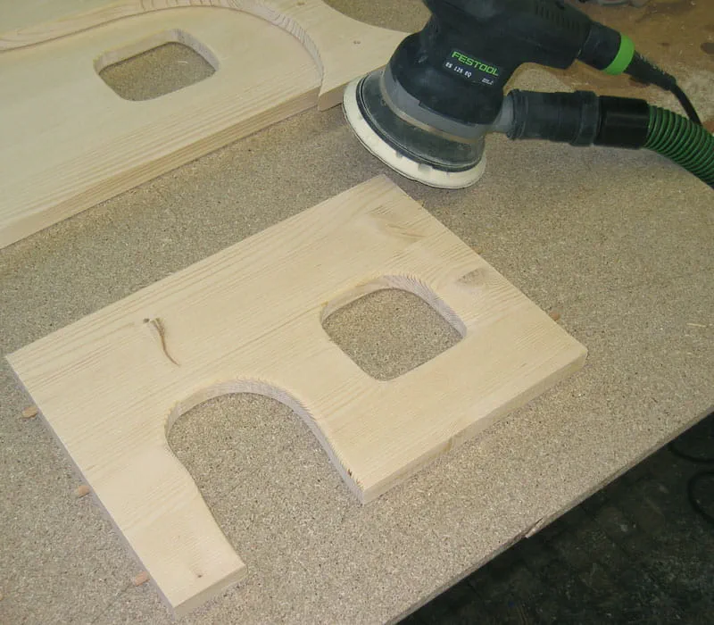 Jednotlivé hrany se obrousí a zaoblí pomocí horní frézky nebo ručně. Plochy se obrousí pomocí excentrické brusky nebo ručně.