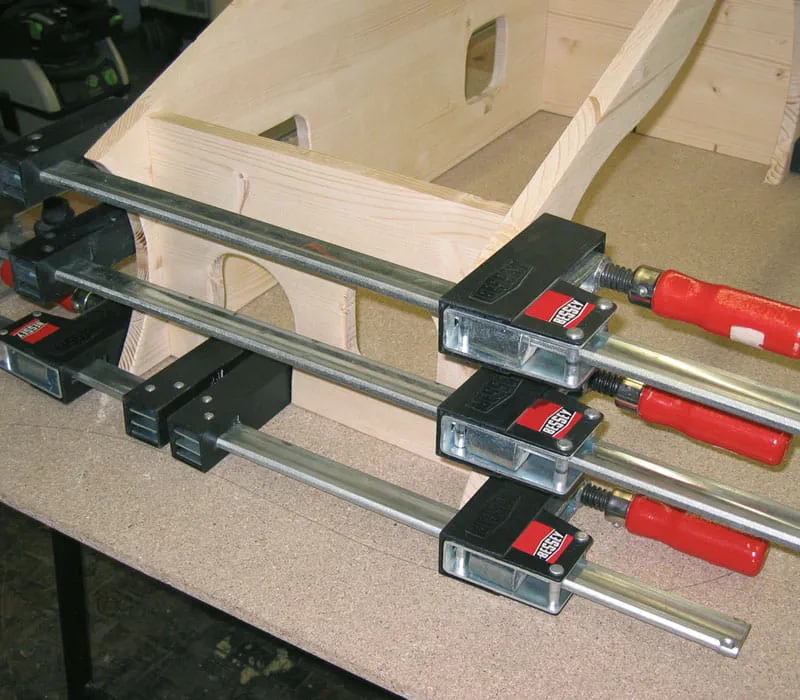 Díly se k sobě stáhnou svěrkami a příložkami nebo speciálními svěrkami (např. svěrkami na korpusy). Na dveře se nasadí dvě svěrky (viz obrázek)