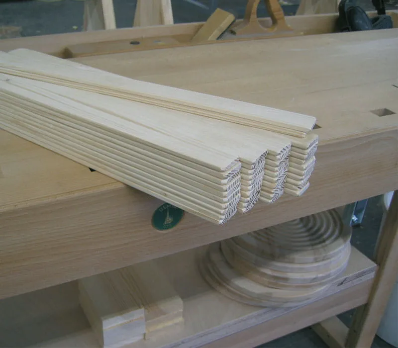 Během schnutí lepidla se nařežou na délku střešní lišty (metráž z obchodu se dřevem) a srazí se hrany.