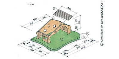 Jednotlivé díly jesliček se sestaví a otvory pro kolíky se přenesou na vyznačenou středovou čáru. Alternativně se otvory pro kolíky přenesou pomocí značicích hrotů. Kolíky (poz. 8)