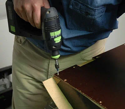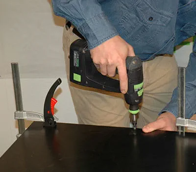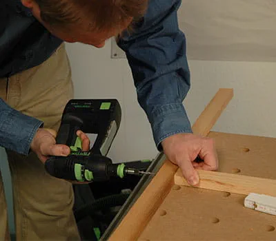 Po sešroubování rámů nosné konstrukce nasaďte vnitřní obložení (poz. 2, 7, 13). Desky upevněte svěrkami a vyvrtejte otvory pro šrouby. Přišroubujte desky pomocí šroubů Spax (3,5 × 20 mm) k nosné konstrukci.