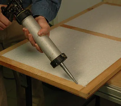 Když jsou všechny vnitřní desky a podlahová deska (poz. 1) přišroubované, uřízněte polystyrenovou izolaci a desky vložte do rámečků. Nakreslete polohu nosné konstrukce na vnějších obloženích (poz. 6, 12). Ta se přilepí ke zbytku stěny (PU lepidlem). Nyní se jednotlivé díly stěny stáhnou svěrkami.