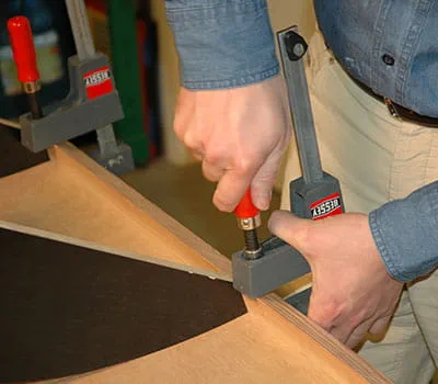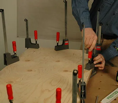 Nosnou konstrukci s přítlakem odvalte na obložení a upevněte ji svěrkami nejprve uprostřed, potom na druhé zakončovací liště. Abyste dosáhli dobrého výsledku, použijte co možná nejvíc svěrek. Pokud jsou po zaschnutí ještě vidět mezery, utěsněte je uvnitř střechy silikonem.