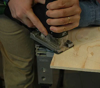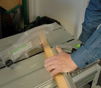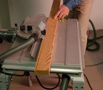 Abyste získali přesnou hranu řezu, nastavte kyvný zdvih přímočaré pily do polohy 1. Stolní okružní pilou šikmo seřízněte zakončovací lišty střechy na správnou délku. Při podélných řezech do masivního dřeva je bezpodmínečně nutné používat hrubý pilový kotouč. Stolní okružní pilou uřízněte lišty na správnou délku.