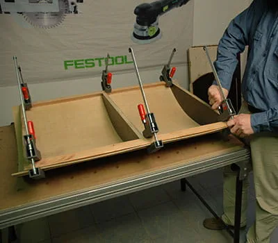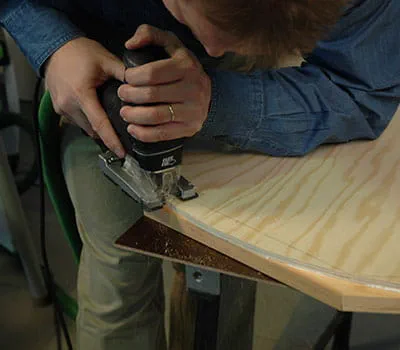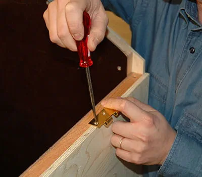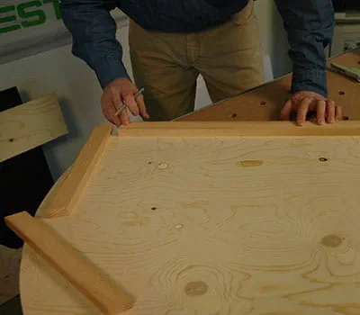 Když je nyní střecha položená a vyrovnaná, vyznačte polohu závěsů. Špičákem vyznačte vnější stranu stěny na dolní hraně závěsu. Střechu znovu sejměte a přišroubujte závěsy. Nyní lze celou boudu smontovat a zbrousit všechny hrany a rohy. Boudu znovu rozložte a excentrickou bruskou obruste všechny vnější plochy.