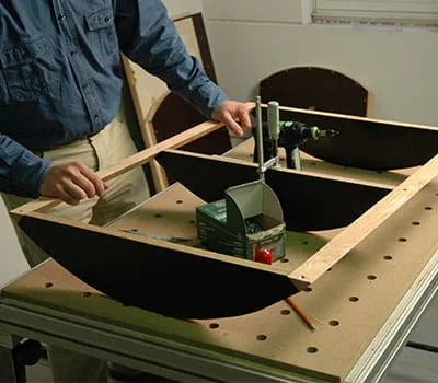 Oba štíty k sobě upněte a hrubým brusným papírem obruste horní oblouk. Pokud máte horní frézku s kopírovacím kroužkem, můžete zaoblení štítových stěn také vyfrézovat. Vyznačte polohu nosné konstrukce (poz. 10, 11) na štítové stěny.