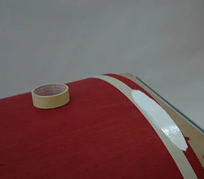 Pro usnadnění přesného umístění je důležité, abyste vyznačili přesah střechy. Pro přilepení opět použijte polyuretanové lepidlo. V tomto pracovním kroku musíte pracovat se dvěma osobami. Také je vhodné to celé předem vyzkoušet „nasucho“ (bez lepidla). Naneste lepidlo na střešní trámky a upevněte obložení na jedné vnější straně.