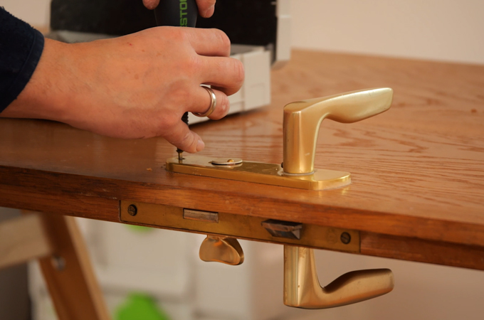 Po zaschnutí se kování opět připevní ke dveřím. K tomu lze opět použít sadu západek. Dveře jsou pak hotové a můžete přejít k dalšímu projektu.