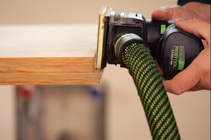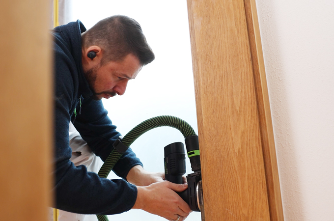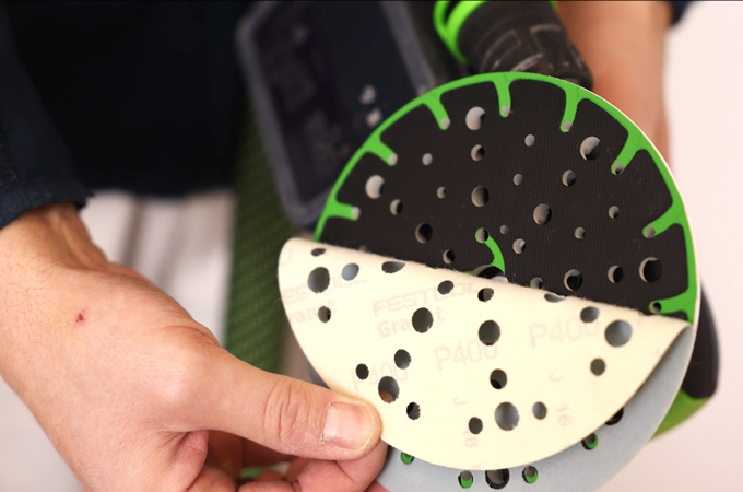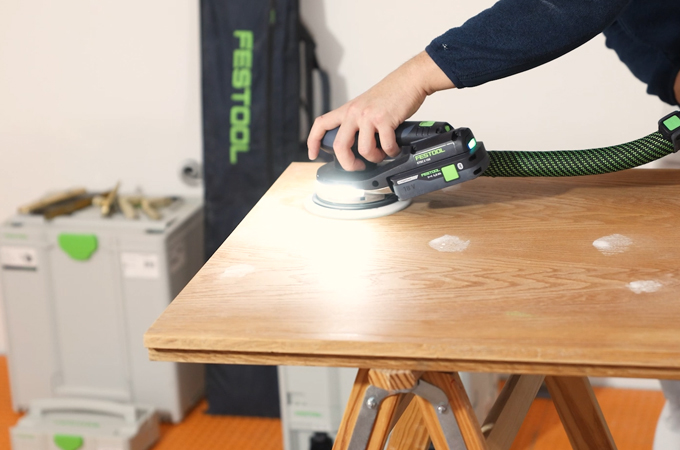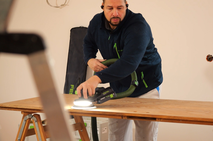 Nyní brousíme dveře. K dosažení rovnoměrné a kvalitní povrchové úpravy použijeme excentrickou brusku - nejlépe ETSC 2 150. Jako brusivo doporučujeme použít univerzální brusný papír Granat zrnitosti P180. Tím zajistíte, že obě strany dveřního křídla budou obroušeny rovnoměrně. Díky integrovanému světlu lze přímo rozpoznat případné nerovnosti nebo poškození povrchu dveří a v případě potřeby je označit kolíkem.