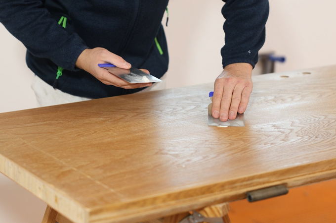Již při broušení dveří pomocí brusky ETSC 2 a jejího integrovaného světla jsou viditelné nedokonalosti a škrábance. Pomocí malé pracovní svítilny KALC se povrch znovu podrobně zkontroluje a poškozená místa se označí tužkou. Poškození se poté vyrovnají japonskou špachtlí a syntetickou pryskyřicí nebo jemným plnivem, aby se dosáhlo co nejhladšího povrchu. Tip: Při nanášení plniva dbejte na jeho čisté odstranění, abyste dosáhli rovnoměrného výsledku.