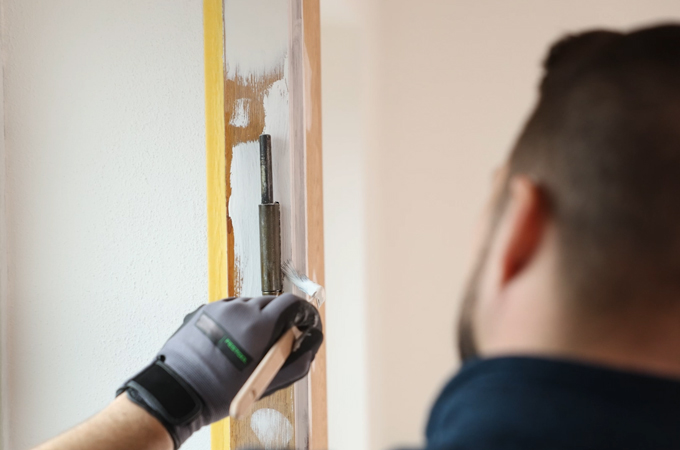Po zaschnutí základního nátěru je vhodné dveře znovu zkontrolovat, zda nejsou poškozené. Pokud objevíte další poškozená místa, můžete je znovu opravit jemným plnivem. Praskliny nebo podobná místa lze rovněž opravit akrylátem. Po zaschnutí opravených míst je možné plochy a případné zbytky plniva opět přebrousit. U velkých ploch doporučujeme použít excentrickou brusku, ideálně s Granatem zrnitosti P400. Detaily a těžko přístupná místa lze opracovat pomocí brusné houby. Nepoužívejte hrubší zrnitost, jinak dojde k přílišnému odstranění podkladového nátěru. Nakonec provedte odsávání povrchu a očistěte ho hadříkem na vázání prachu.
