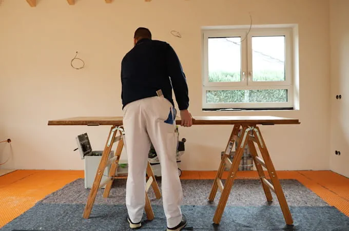 Prvním krokem je kontrola dveří. Jsou dveře nějak viditelně poškozené nebo se třou o podlahu? Pokud se vyskytnou nějaké problémy, doporučujeme upravit dveře na výšku podlahy. Výška podlahy se při rekonstrukcích často mění - ať už kvůli podlahovému vytápění nebo nové podlahové krytině. Změříme proto novou výšku v místě závěsů dveří a pomocí ponorné pily a Vodicí lišty zkrátíme dveřní křídlo na správnou výšku.