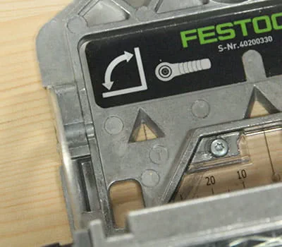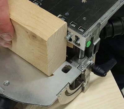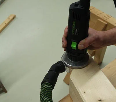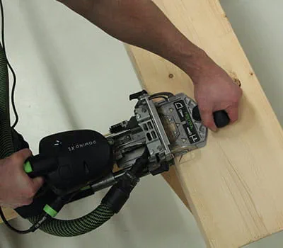 Pro první frézování na koncích sloupku se zvolí prostřední dorazový pin. Ten odpovídá poloze trojúhelníkového průzoru v dorazovém stole. Na koncích sloupku tak lze provést nasazení pomocí dorazového pinu a na trámech pomocí průzoru. Při pracích s DOMINO XL je bezpodmínečně nutné připojit mobilní vysavač.