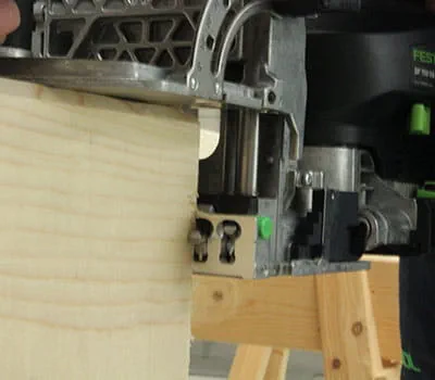 Nyní nasaďte DOMINO XL na značku na sloupku a proveďte první frézování. Poté proveďte druhé frézování a dbejte na to, aby dorazový pin (prostřední) znovu doléhal k prvnímu vyfrézovanému otvoru.